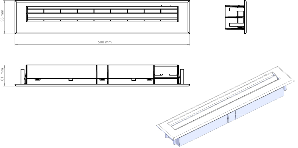 Der Luftstrom kann mit dem Schiebegitter beliebig gedrosselt werden. Abhängig von der Montagerichtung der Blende wird der Luftstrom nach rechts oder links gerichtet. Die innovativen Montagehilfen garantieren einen schnellen Einbau. Alle Elemente sind von innen zugänglich und lassen sich einfach ausbauen und reinigen. Auf Wunsch wird die Blende bei einer Abnahme grösserer Mengen in einem beliebigen RAL-Farbton geliefert.