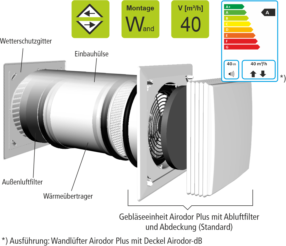 Der Wandlüfter Serie AIRODOR Plus ermöglicht einen reversierenden Zu-/Abluftbetrieb mit Wärmeübertragung inklusive Filterung der Außen-/Abluft (Standard: ISO Coarse >45% -alt G3-). Einsetzbar für einen Luftaustausch z.B. in einem Wohnraum bzw. zur Entlüftung einer Wohnung (Nutzereinheit). Im Abluftbetrieb nimmt ein Keramikspeicher Wärme auf und überträgt diese beim Zuluftbetrieb auf die durchströmende Außenluft. Die Luftrichtung wird mit einem Gebläse (Drehrichtung umkehrbar) und einer abgestimmten Steuerung vorgegeben.