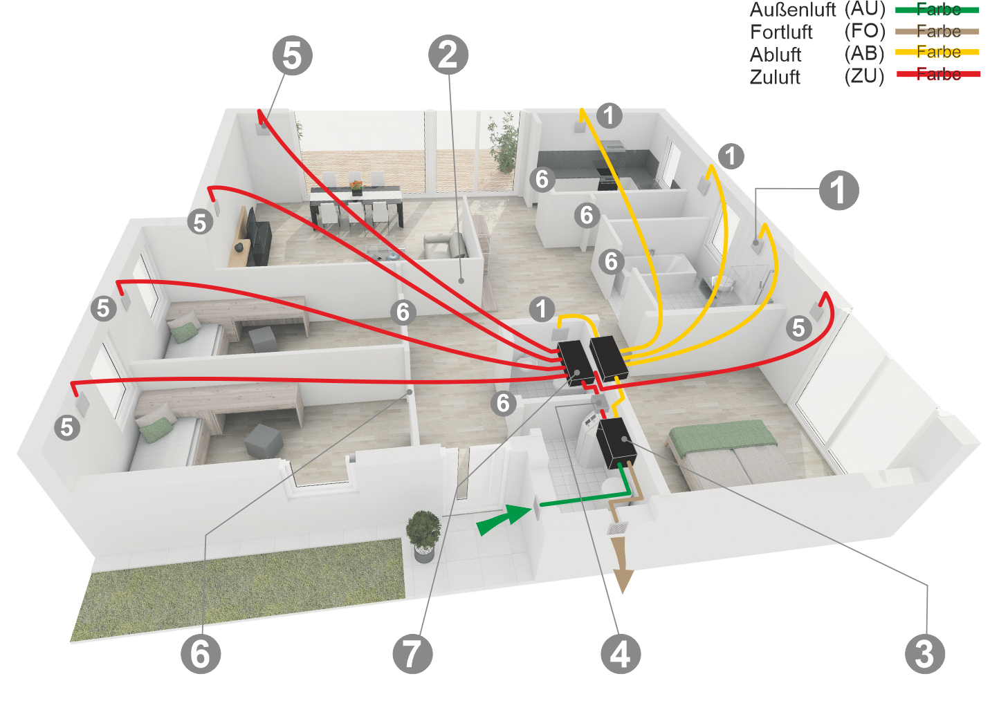 Eine smarte Steuerung und Sensoren regeln für alle Räume die Zu- und Abluftkomponenten. Auch Wärmerückgewinnung ist integriert – eine effiziente Lösung für modernes Wohnen. Gestiegene Komfortbedürfnisse und behagliches Raumklima, aber auch Schutz vor Schimmel oder gefährlichen Gasen sind ihre Stärken.