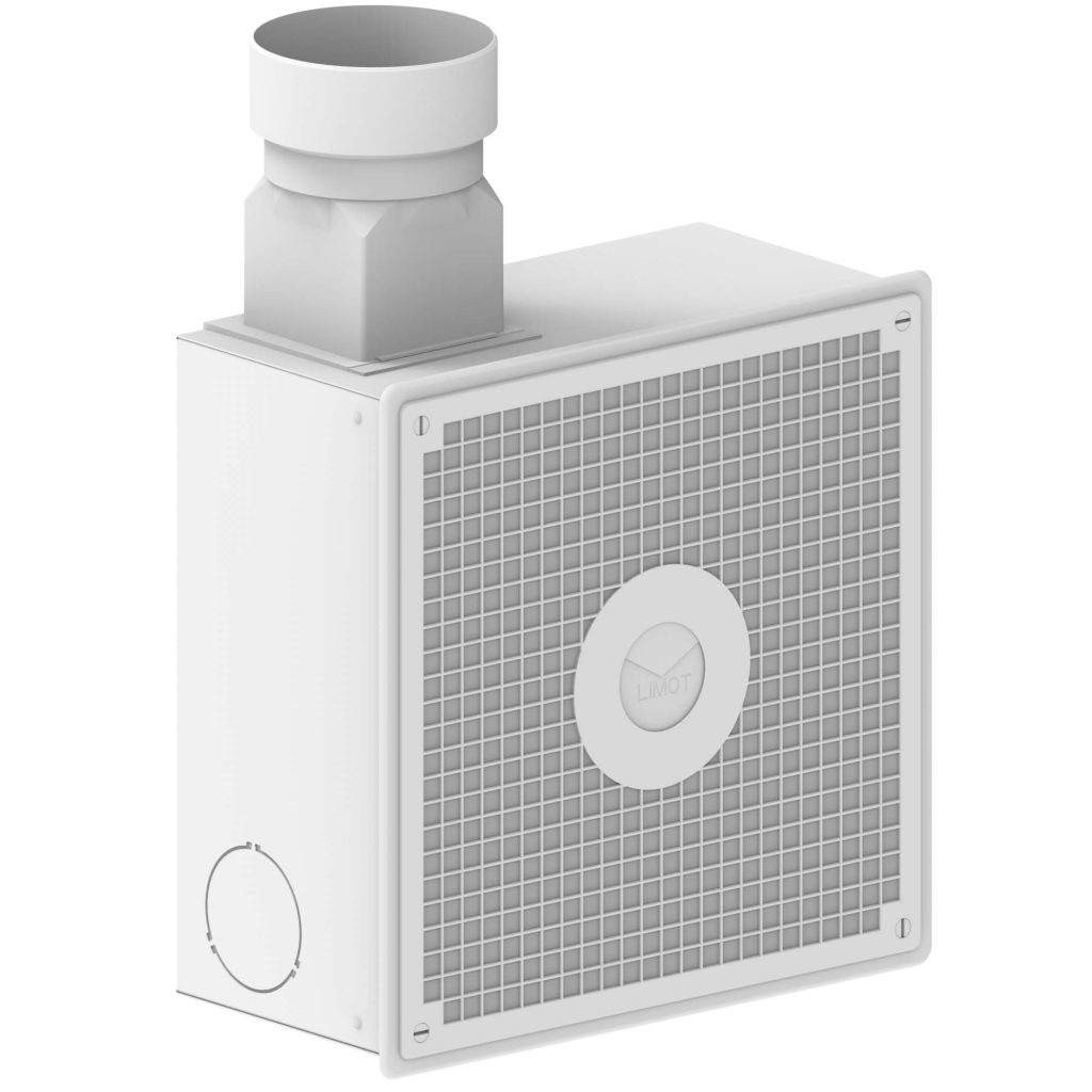 Lüftungsgerät für den Einbau in Wände oder Decken (ohne Brandschutzanforderung). Der Anschlussstutzen ist seitlich am Metallkasten angebracht. An den Seiten sind vorbereitete Anschlussöffnungen für einen Ansaugstutzen AS (Zubehör) vorhanden. Die Einbaulage des Lüftungsgerätes ist durch die federbelastete Rückschlagklappe variabel und verhindert eine Geruchs- und (Kalt)Rauchübertragung -Leckluftrate < 0,01 m³/h-.
