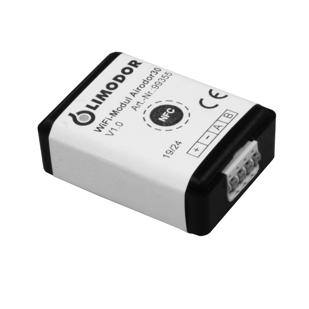Erweiterungsmodul zur Ansteuerung von Wandlüftern Serie AIRODOR über einen Browser nach Einbindung in einhauseigenes WLAN-Netz oder direkter Ansteuerung (Point-to-Point) mittels APP. Die Bedienung des integrierten Programmes (HTLM-basierend) ist über ein Passwort geschützt. Einsetzbar in Verbindung mit Steuerung AD-UV (Zubehör Art.-Nr.: 99340). Montage in bauseitiger Schalter-/Abzweigdose mit einer metallfreien Abdeckung z.B. Dosendeckel. Kabelanbindung mit 4-adrigem Kabel (max.4×0,8mm2). Die Kabellänge zwischen Steuerung AD-UV und WiFi-Modul darf 20 m nicht überschreiten. Das Modul ist mit einer NFC-Technik (Nah-Feld-Kommunikation) ausgestattet und ermöglicht z.B. eine Erstverbindung mit einem geeigneten Smartphone.